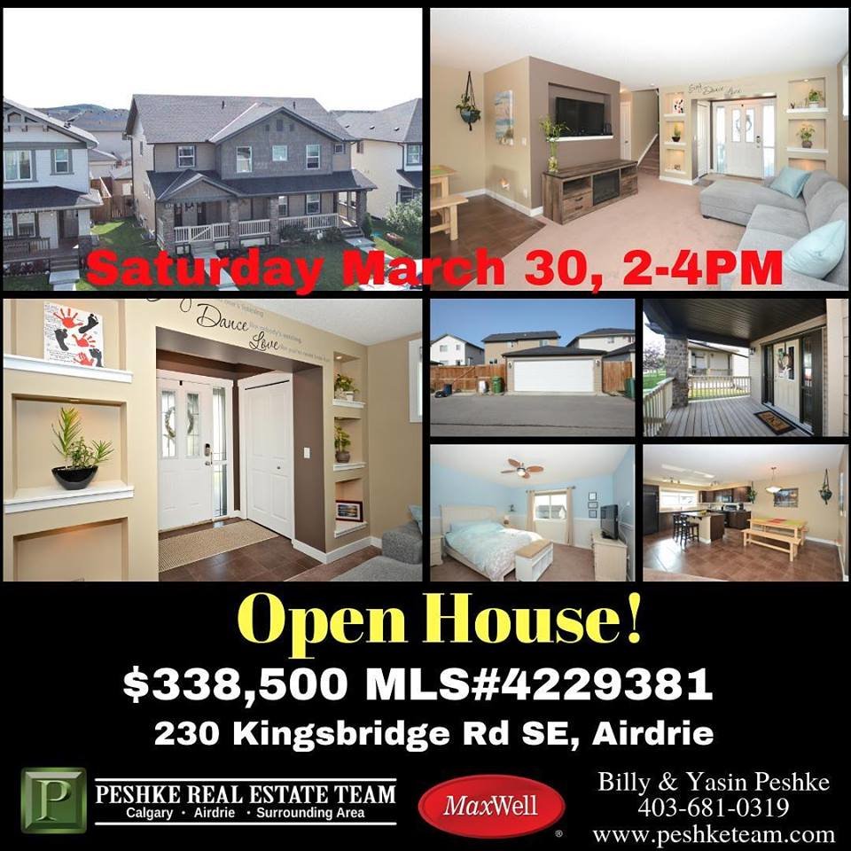 Open House Saturday March 30, 2-4 at 230 Kingsbridge Rd S.E, Airdrie. Come and check out this affordable half duplex in showhome condition with oversized garage in Kings Heights Airdrie.